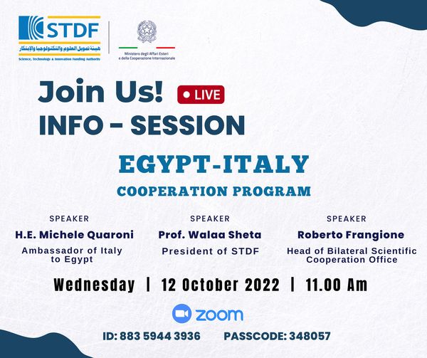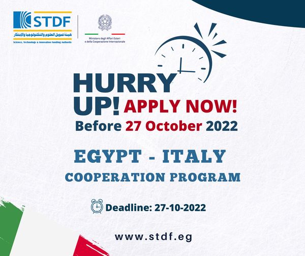 Only 7 days left to get your applications in! for “Egypt – Italy Scientific Cooperation Executive Program” to obtain STDF funding : up to 3 million EGP .. We encourage you to apply early! Fill and submit your application here…